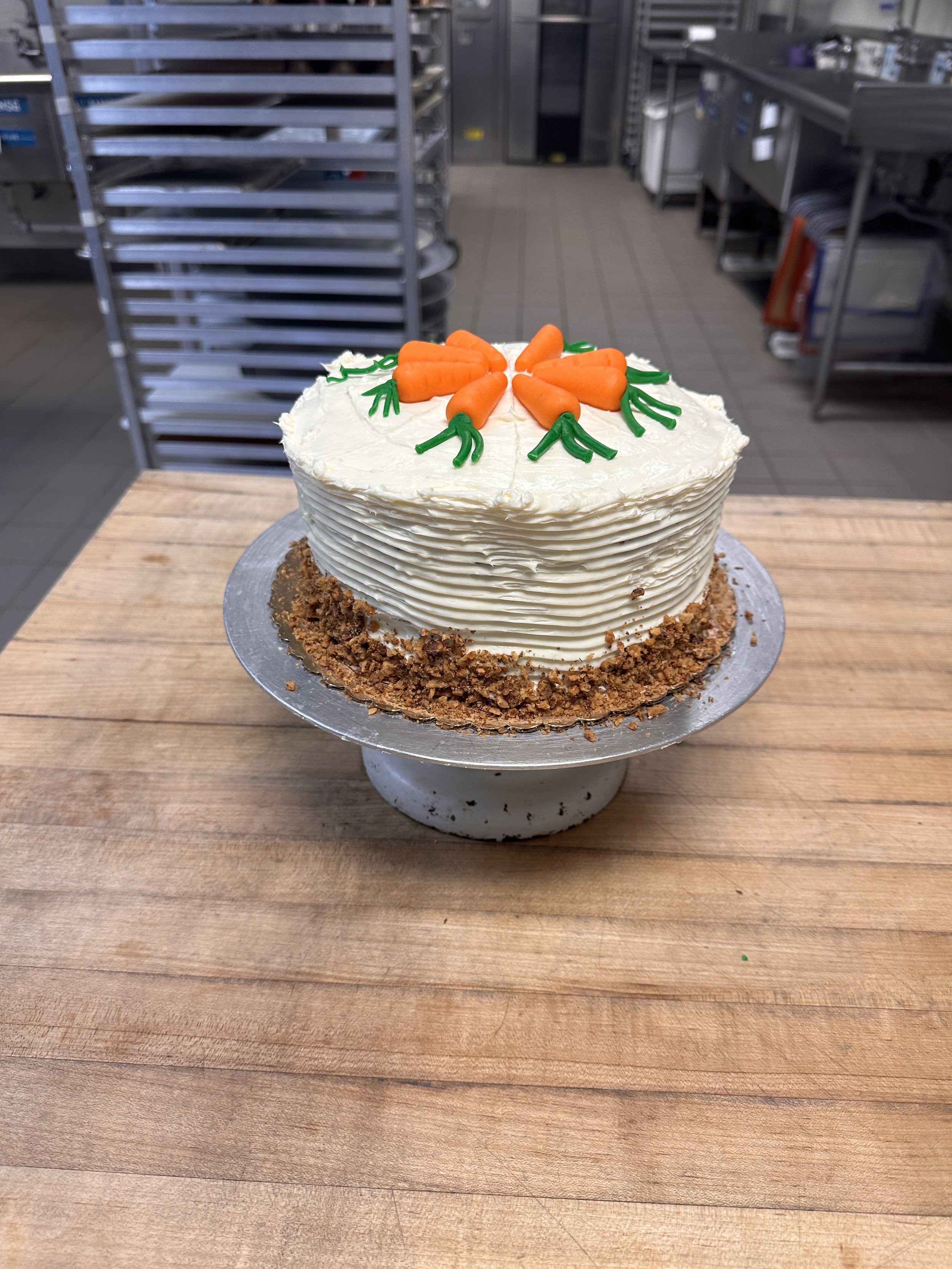 Moist spiced carrot cake layered with smooth cream cheese frosting, finished with a rustic ribbed design and hand-piped carrot detail.