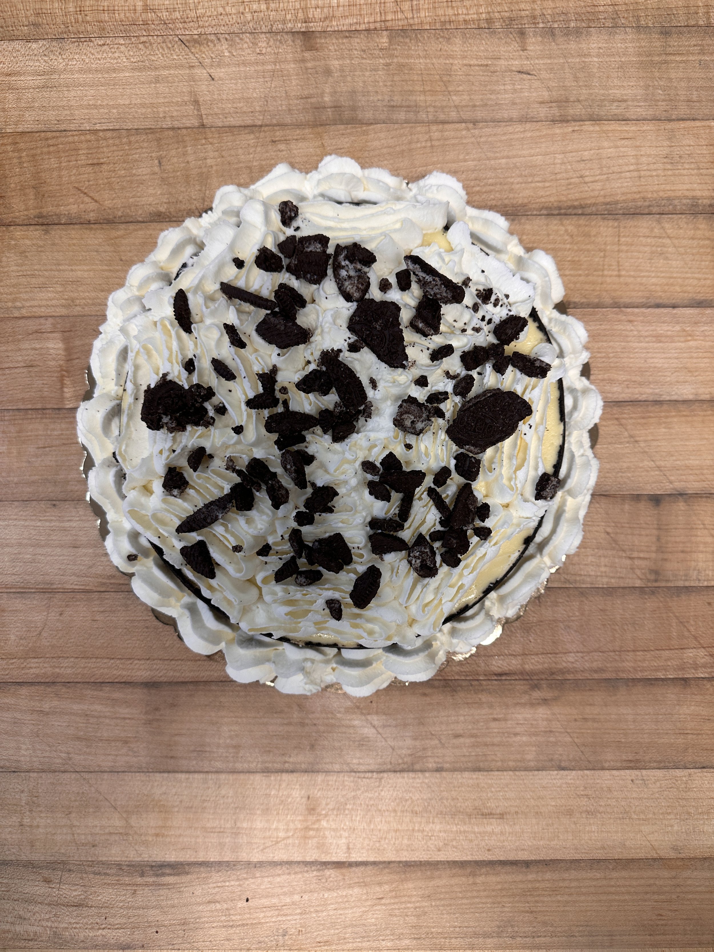 Classic baked cheesecake with crushed chocolate sandwich cookies, finished with piped whipped cream and cookie crumble.